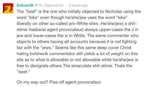 Oh i know…i have two other aliases of my mine that have been perm-banned from amen going on 3 yrs or more…not all posters get the ban that say anything against the kike agenda as in you know who…in this case I could not resist. Aggravating to see a so-called pro-White site like amren have posters complaining about White Polish people immigrating to the UK. Also very aggravating to see Taylor post an article on a jew reporter he invited to his home recently,not once but twice, and never mentioned not once that he was a jew. Anglin named the jew and his family connections with other big jews in an article he written here on his site.