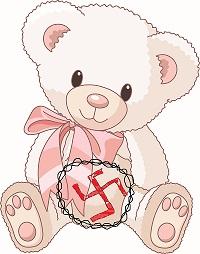The most doe eyed, pale pink, innocent, would I hurt anyone, hand drawn cartoon teddy bear. Looking up smiling but like its about to cry maybe. Holding a little swastika in its lap. Like a Hitler care bear.
